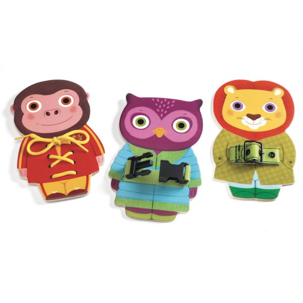 Kolme puista eläintä, joiden vaatteissa on erilaiset kiinnitystavat: nauhat, vyönsolki ja muovinen solki.