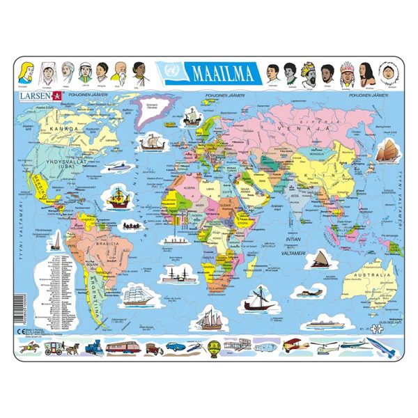 Perinteinen pahvinen opetuspalapeli jossa kuva maailmankartasta. Palapelissä on 107 palaa ja tekstit suomeksi.