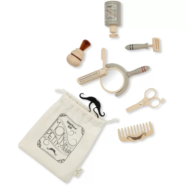 Konges Sløjdin ihastuttava puinen parturisetti on täynnä parturin työkaluja, jolla leikkiä parranhoito- ja hiustenleikkuuleikkejä kotona.